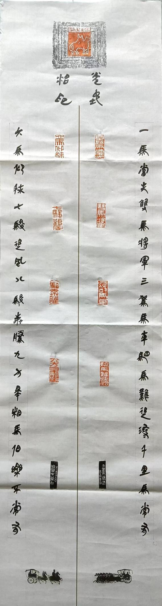 “马上成功”马年对联印文作品,以“九方皋相马”为故事主题,通过运用“一到九”数字递增式成语组合而成一对马年春联,突出强调马群之强壮与声威之盛大。整体上,对联印文描绘了骏马在战场上的英姿飒爽与声名远播,既巧妙体现了数字的递增,又展现马之英勇与气势。同时,道出“千里马常有、伯乐不常有”,以及“人间正道是沧桑”的人生哲理,无不令人回味……