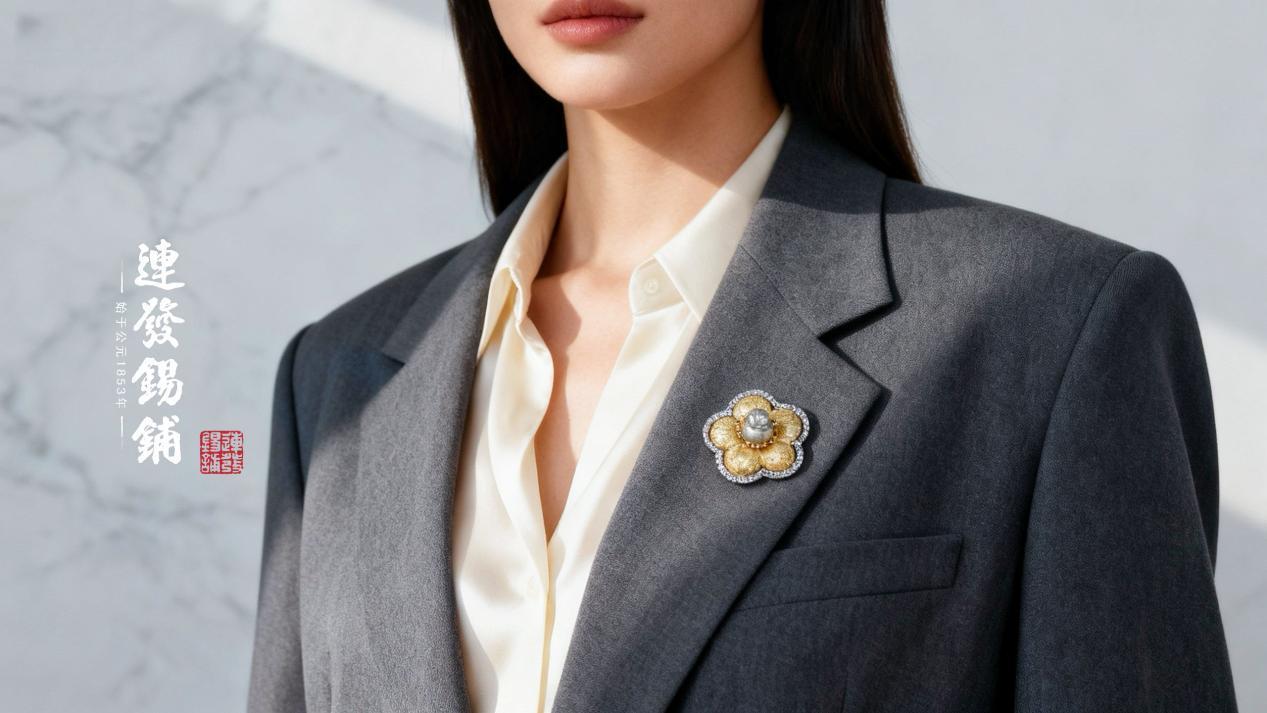 马上有钱花胸针/鎏金花瓣绽放出璀璨光泽,莹润钻边勾勒花型轮廓,手工雕制灵动锡小马头嵌于花心,是“马上/有钱花”的吉祥巧思。大师以锡艺匠心打造,将财运与浪漫凝于胸间,一枚胸针,让花开富贵的美好寓意,随衣襟摇曳生姿。