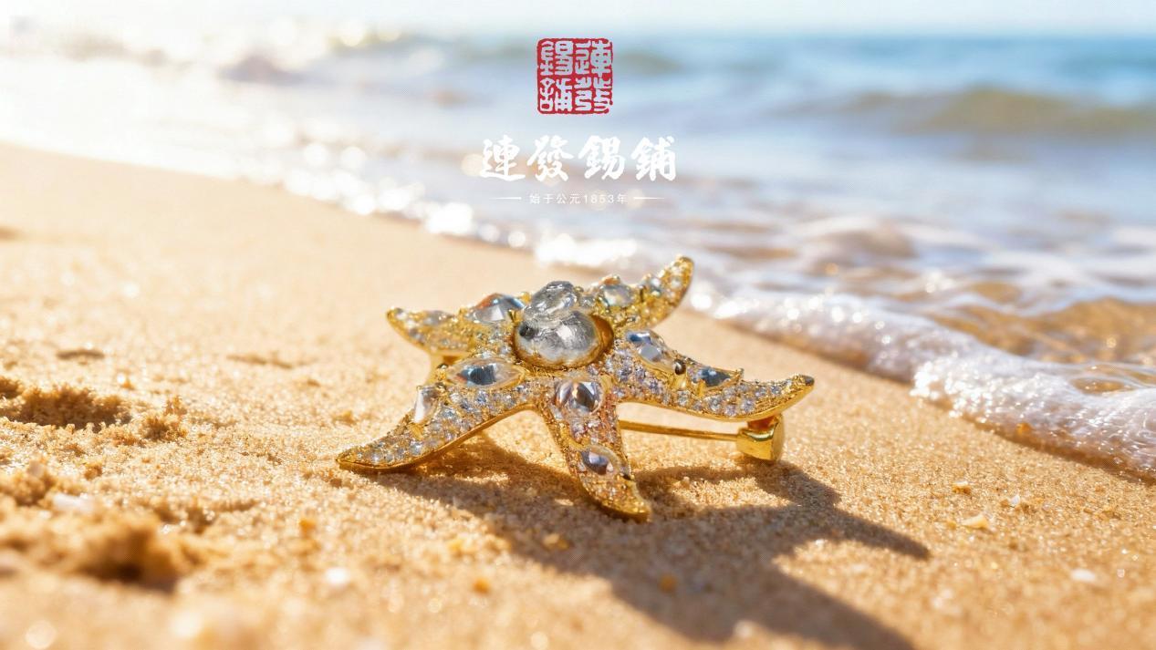 策马逐星胸针/锡艺精雕的小马头嵌于星芒核心,满钻勾勒出灵动的海星轮廓,鎏金与晶钻交叠出璀璨光泽。大师手作的锡艺巧思,将“策马逐星”的豪情与希冀凝于方寸,一枚胸针,让奔赴理想的勇气随衣襟闪耀,星河与征途皆在身旁。