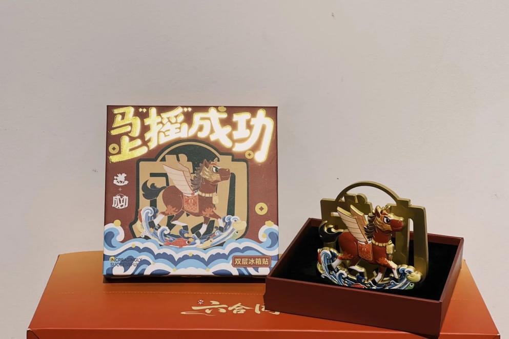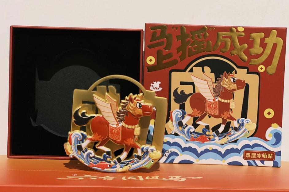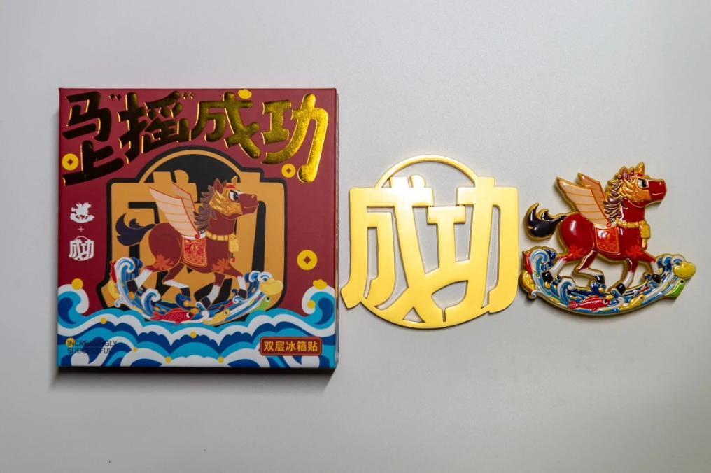 “召召”戴头盔,整体呈奔跑状,是古代战马实战造型和状态。从细节上看,其头盔是一个“1”字,体现“一统江山,一定会成功”的努力奋进方向。其身体设计的是船帆,脚上踏浪。“成功”二字与“召召”可分开作为不同磁贴,结合到一起又是装饰性摆件。