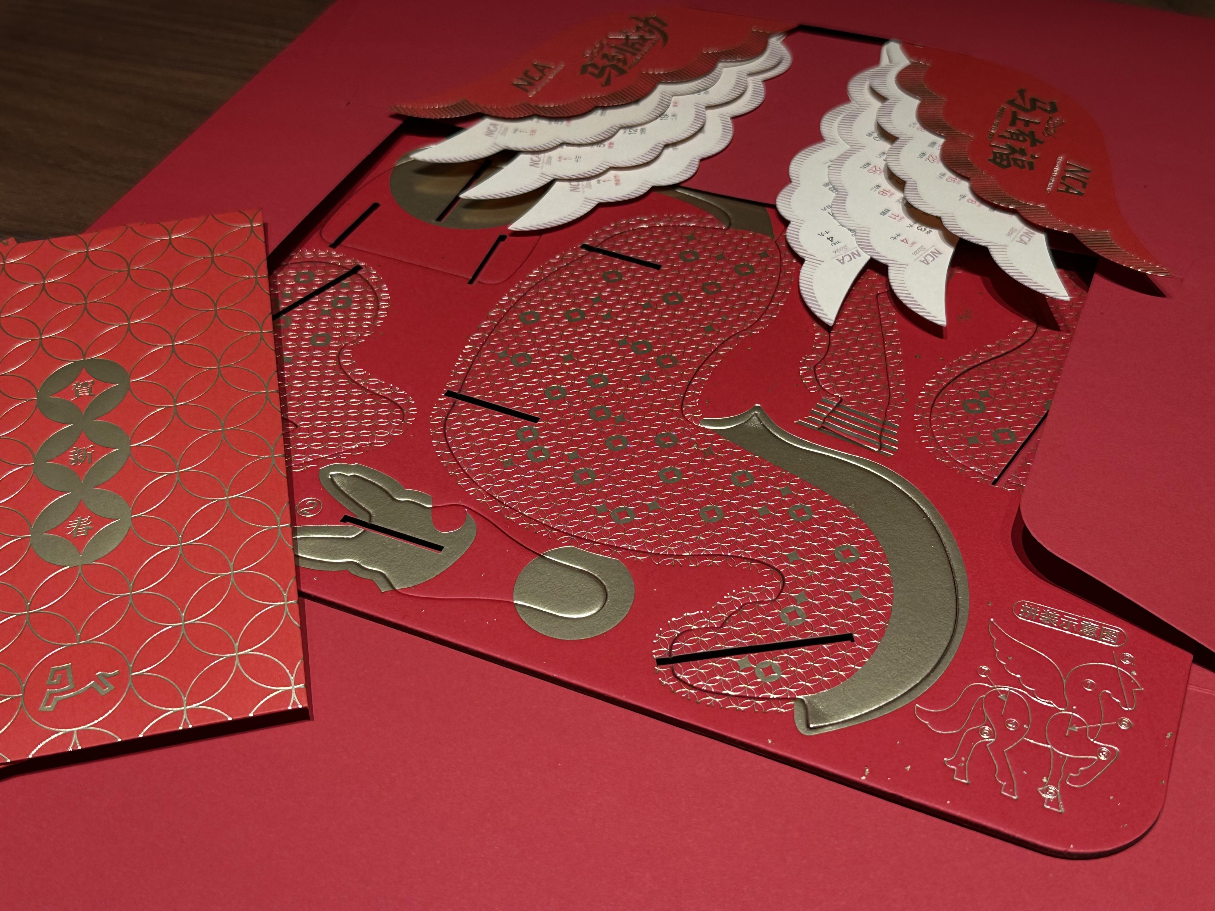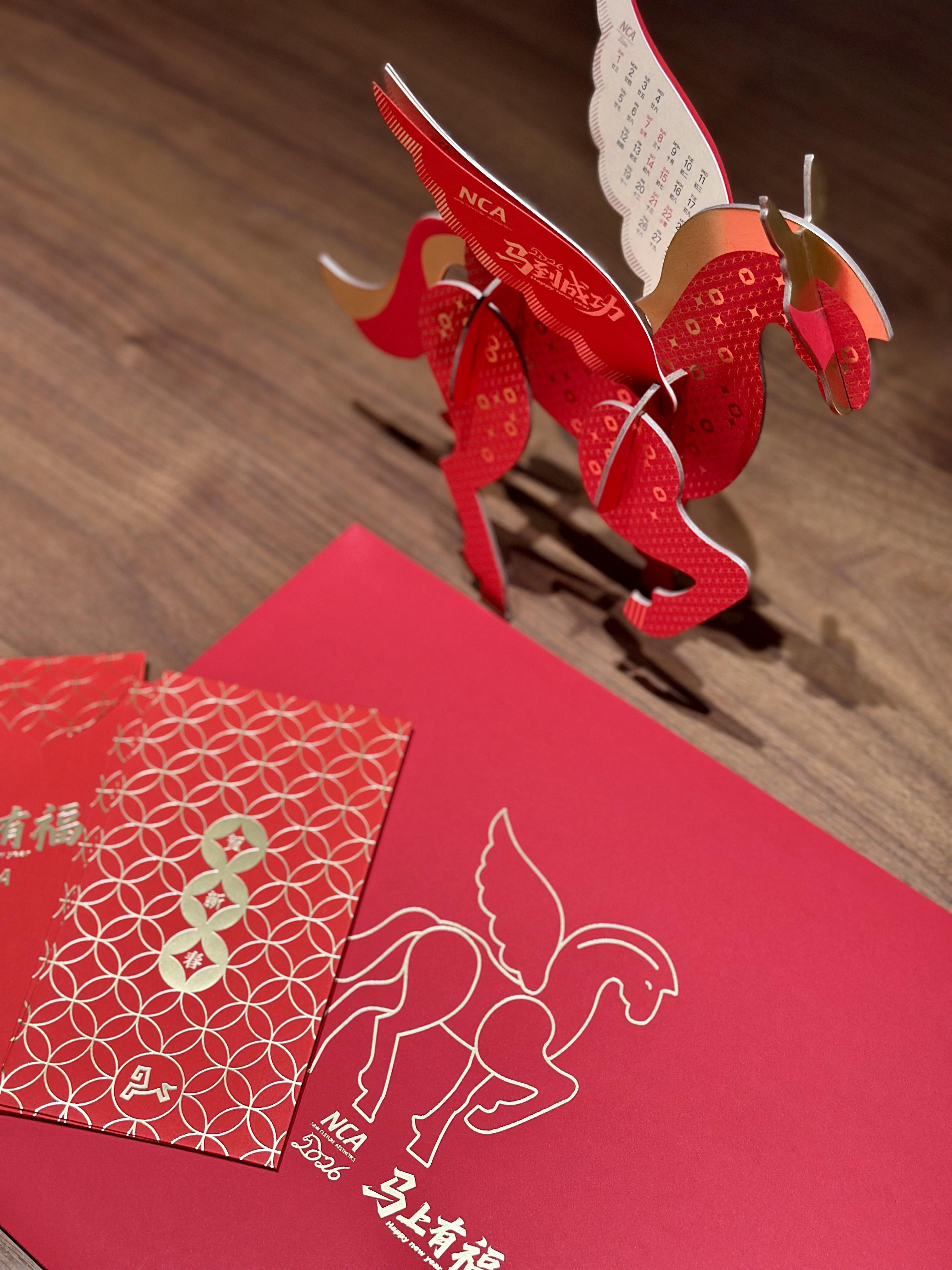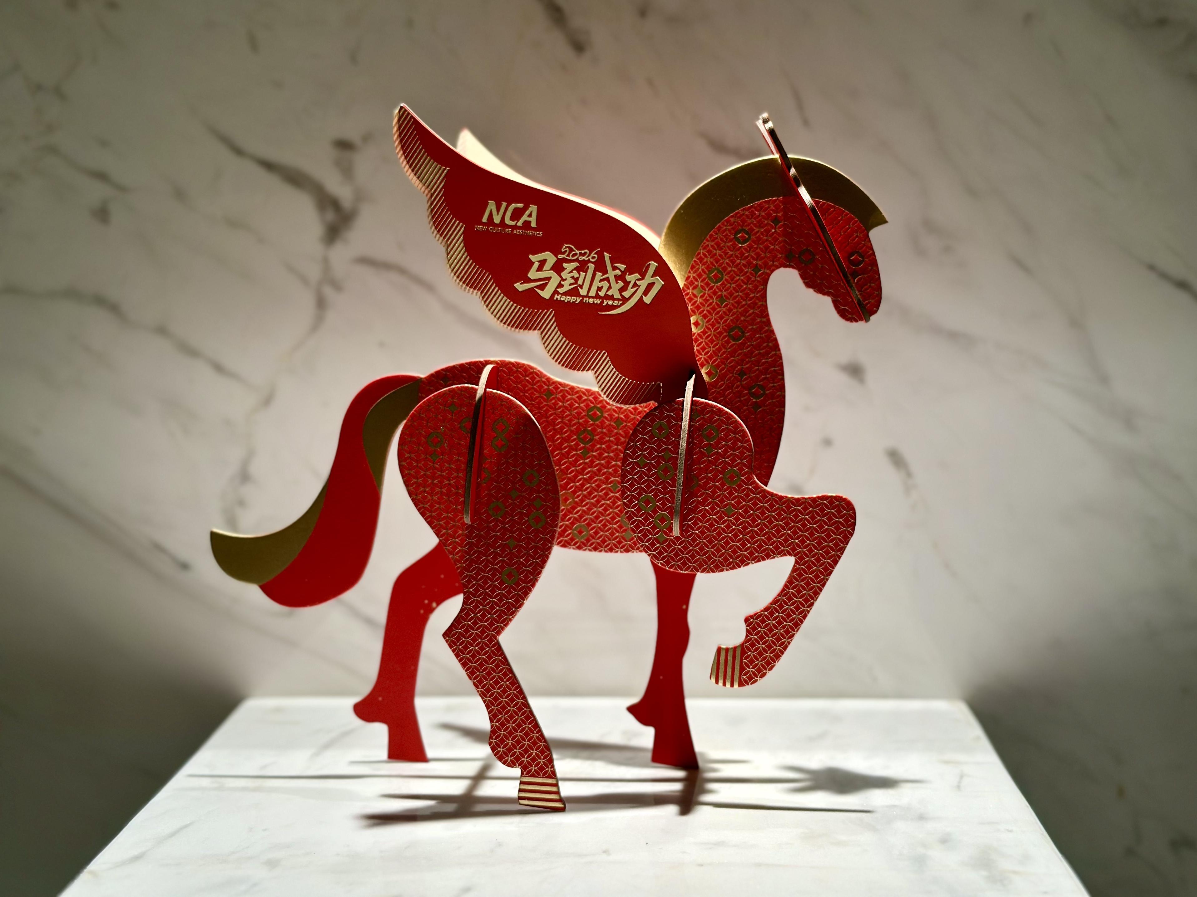 以画家徐悲鸿的奔马为创作元素,结合硬纸板模切工艺,用环保理念组合成阔步前行的骏马造型。大红马底纹镶金币图案,马背上插上印有月份的翅膀,意为腾飞插上翅膀,马上有钱有福、马到成功。