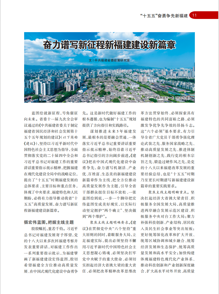 蓝图绘就新征程,号角催征向未来。省委十一届九次全会审议通过的《中共福建省委关于制定福建省国民经济和社会发展第十五个五年规划的建议》(以下简称《建议》),坚持以习近平新时代中国特色社会主义思想为指导,全面贯彻落实党的二十届四中全会和习近平总书记对福建工作的重要讲话重要指示批示精神,把握福建在现代化建设全局中的战略定位,提出了“十五五”时期福建发展的总体要求、主要目标和重点任务,体现了中央要求、福建特色和人民期盼,必将有力指导推动我省“十五五”高质量发展,奋力谱写新征程新福建建设新篇章。