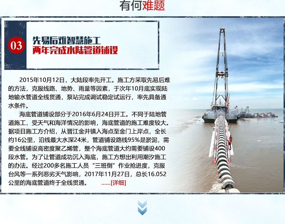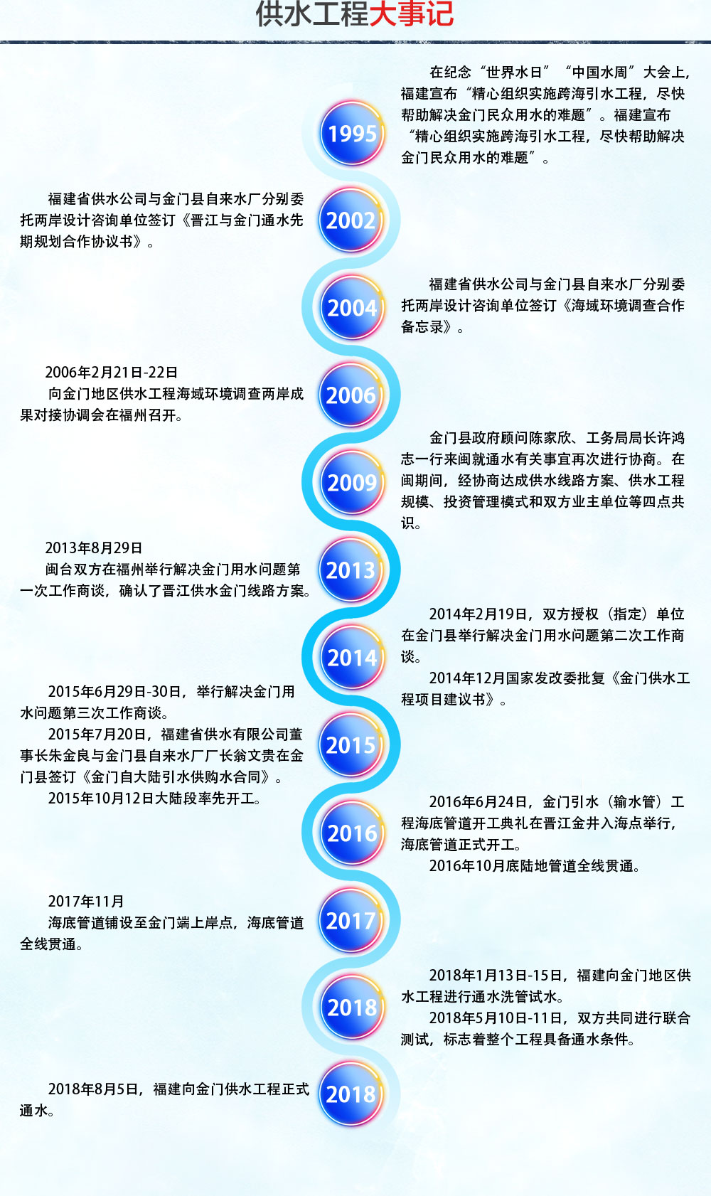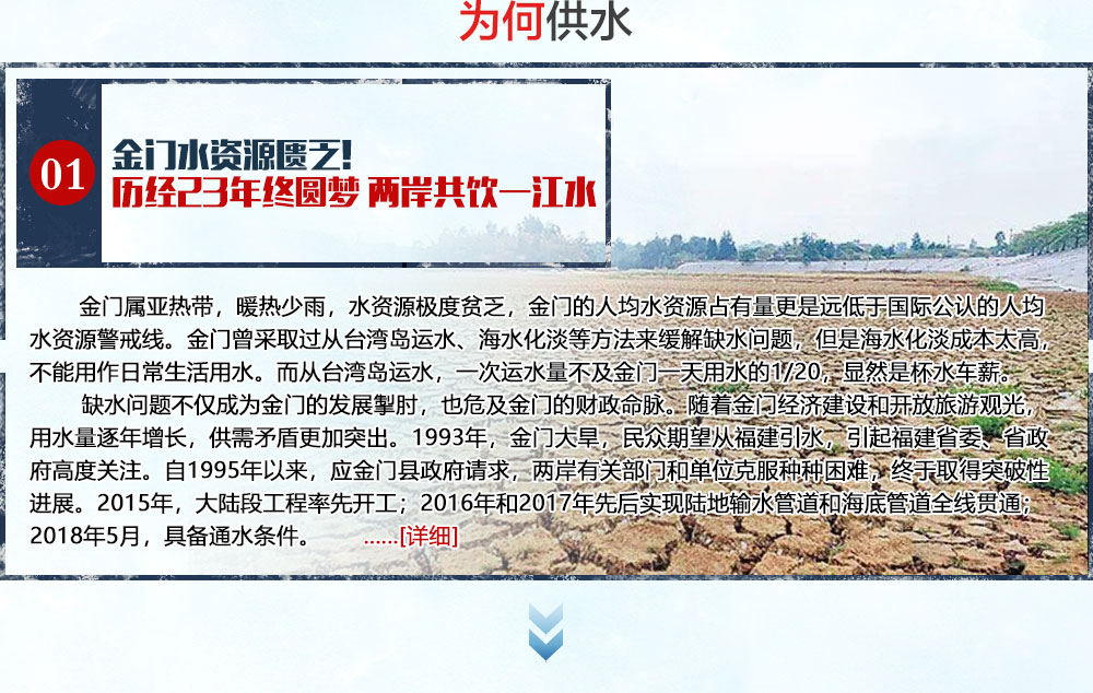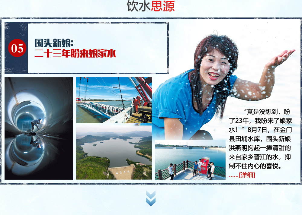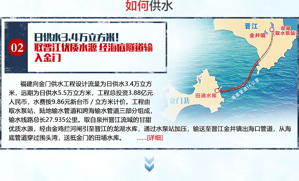 渠成,水到。汩汩流出的晋江水,从大陆这一端启动输送,到金门那一头喷涌出清水,经过的管道长度27.935公里,耗时不过2分钟左右。为了同饮一江水,两岸同胞共同努力了23年。