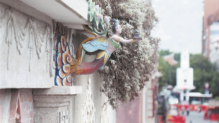 近日,不少市民发现,市区中山路通政巷口的一栋骑楼顶有五尊彩色“妙音鸟”(飞天造型),与开元寺大雄宝殿里的“飞天”神形相似。五尊“飞天”位于骑楼五根柱子上,与南洋风格的骑楼相得益彰,成为中山路一道靓丽的风景。