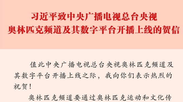 在中央广播电视总台央视奥林匹克频道及其数字平台开播上线之际,中共中央总书记、国家主席、中央军委主席习近平发来贺信,表示热烈的祝贺。