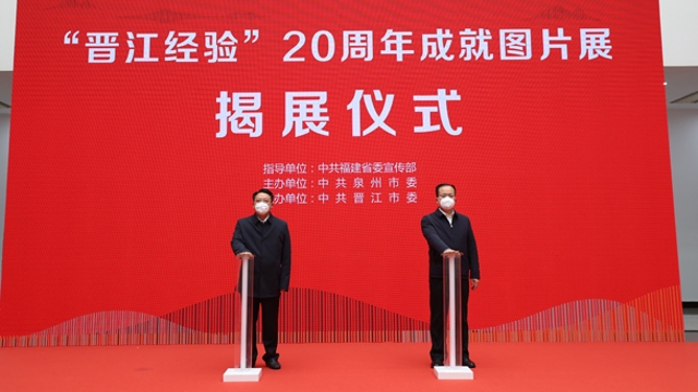 “晋江经验”20周年成就图片展揭展仪式15日上午在晋江市博物馆举行。省委常委、泉州市委书记刘建洋,市长蔡战胜为图片展揭展并参观展览。