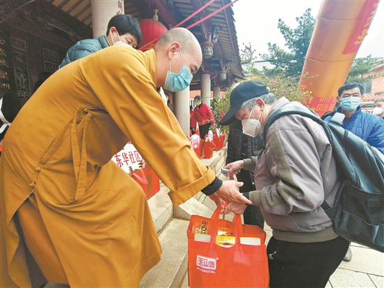 昨日上午,由鲤城区鲤中街道、承天寺联合主办的2023年“迎新春 献爱心”慈善助困慰问活动在承天寺举行,共有237户困难家庭收到由承天寺支持的年货大礼包,其中有6名环卫工人。