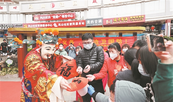 一场主题为“喜迎新春送祝福 和谐社会谱新篇”的学习宣传贯彻党的二十大精神暨喜迎春节的活动,在凤山社区“党建+”邻里中心前的小广场举行。