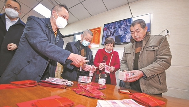 19日,晋江青阳街道陈村社区内喜气洋洋,该社区562名老人依次领到了新年“大红包”。
