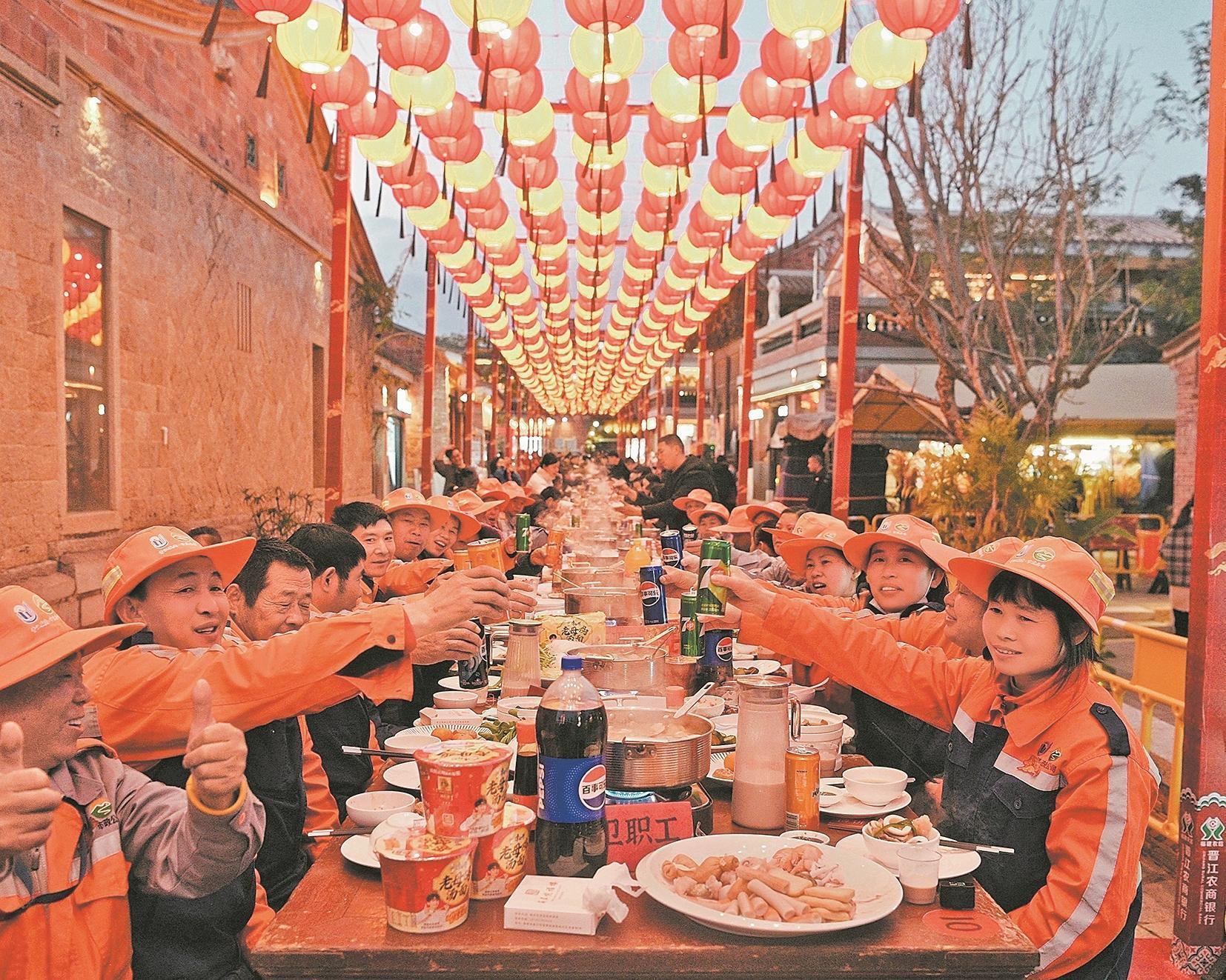 昨日是南方小年,在晋江青阳街道阳光社区星光路的一家饭店内,来自新疆的新晋江人、阳光夜市摊主阿布都拉,为28名城市环卫工送上免费爱心午餐,并且还贴心地送上了米、油等生活物资,以最朴实的行动致敬城市守护者,用烟火气勾勒出各民族交往交流交融的暖心画卷。