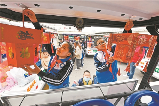 花灯车上挂,民俗车身贴。昨日,泉州公交集团温陵分公司对部分社区巴士“小白”、三轮车“小红”进行装饰,为佳节添彩。