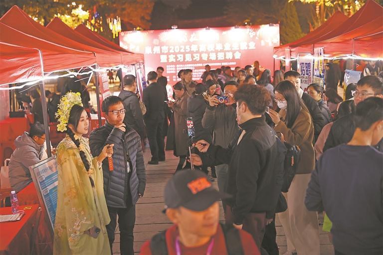 赏花灯同时还能顺便找工作,夜市招聘会烟火气浓。昨晚,由泉州市人社局、团市委、鲤城区人民政府共同举办的“就在八闽”泉州市2025年高校毕业生就业暨实习见习专场招聘会在泉州府文庙广场成功举办。