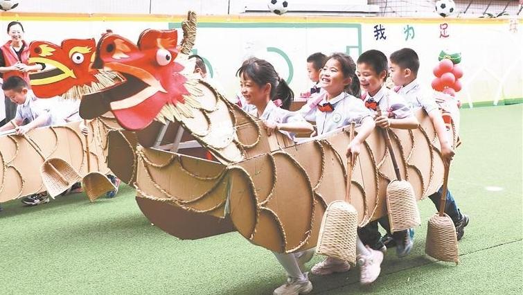 端午佳节到来之际,南安梅山镇的幼儿园小朋友们用废旧纸板等废弃物品做“龙舟”,在陆地上体验了一场别具一格的“龙舟赛”。