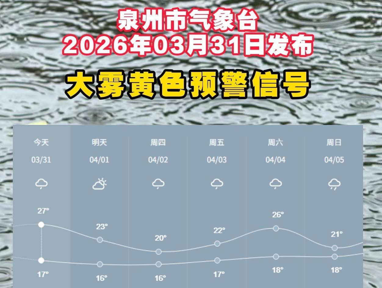 泉州市气象台2026年03月31日发布大雾黄色预警信号