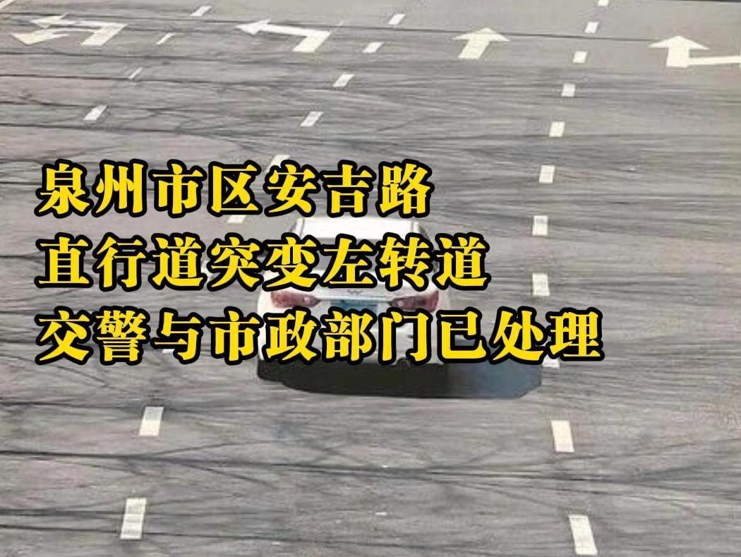 针对泉州市区安吉路直行道突变左转道问题,交警与市政部门已处理——优化调整交通标线,提前标注左转箭头