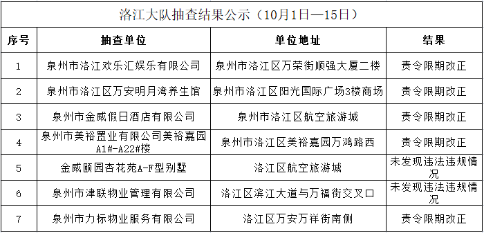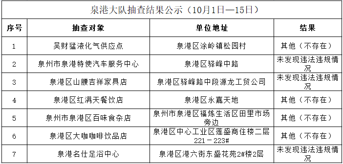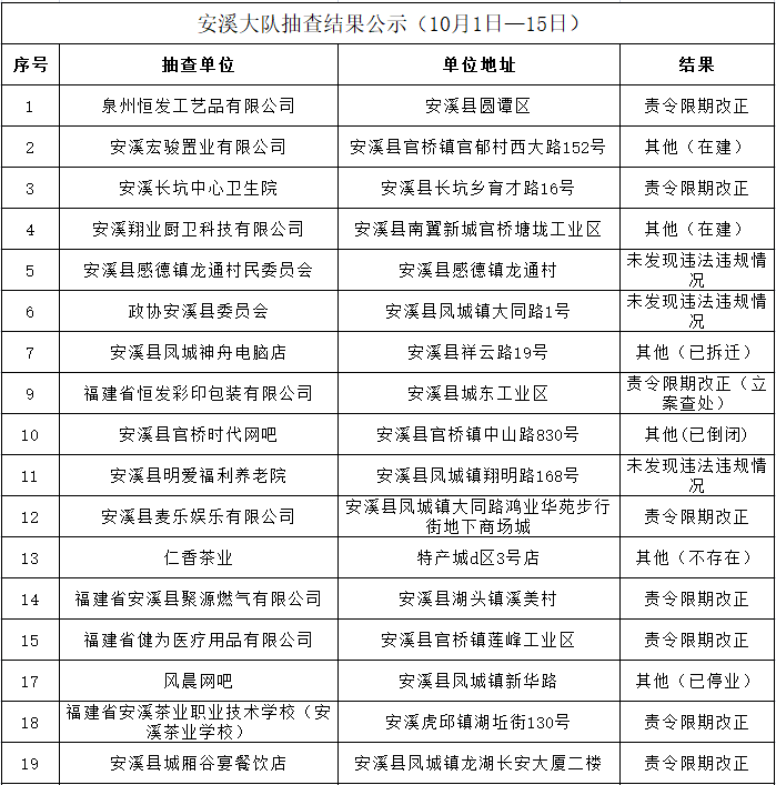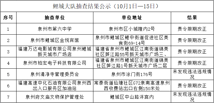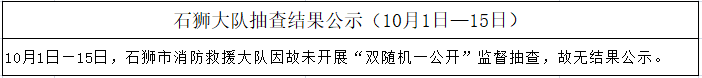 根据《福建省“双随机一公开”消防监督抽查实施细则(试行)》工作要求,10月1日-15日,泉州市各级消防部门将采取“双随机一公开”监督抽查方式对社会单位履行消防安全职责情况开展监督检查。现将全市抽查对象公示如下:
