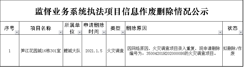 根据总队《福建省公安机关消防机构业务信息系统执法项目信息作废管理暂行规定》(闽公消[2018]94号 )要求,现对支队本级及各大队报送的内外网执法信息作废删除申请情况公示如下,公示期为3个工作日。无异议将按程序报批并做删除作废处理。