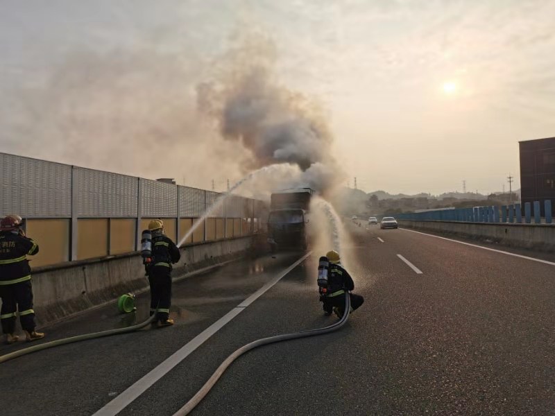 根据现场情况,消防员出动一把水枪,对车体明火进行扑灭,阻截火势蔓延。经过15分钟的紧急处置,确认无复燃风险后,消防员将现场移交给交警处置,指战员收整器材撤离现场。