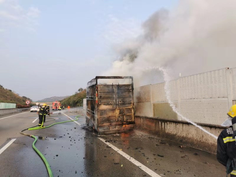 据现场询问车主了解到:他在路面上面行驶,突然闻到一股烧焦味,通过后视镜发现车厢在冒烟,便立即靠边停车并报警救助。