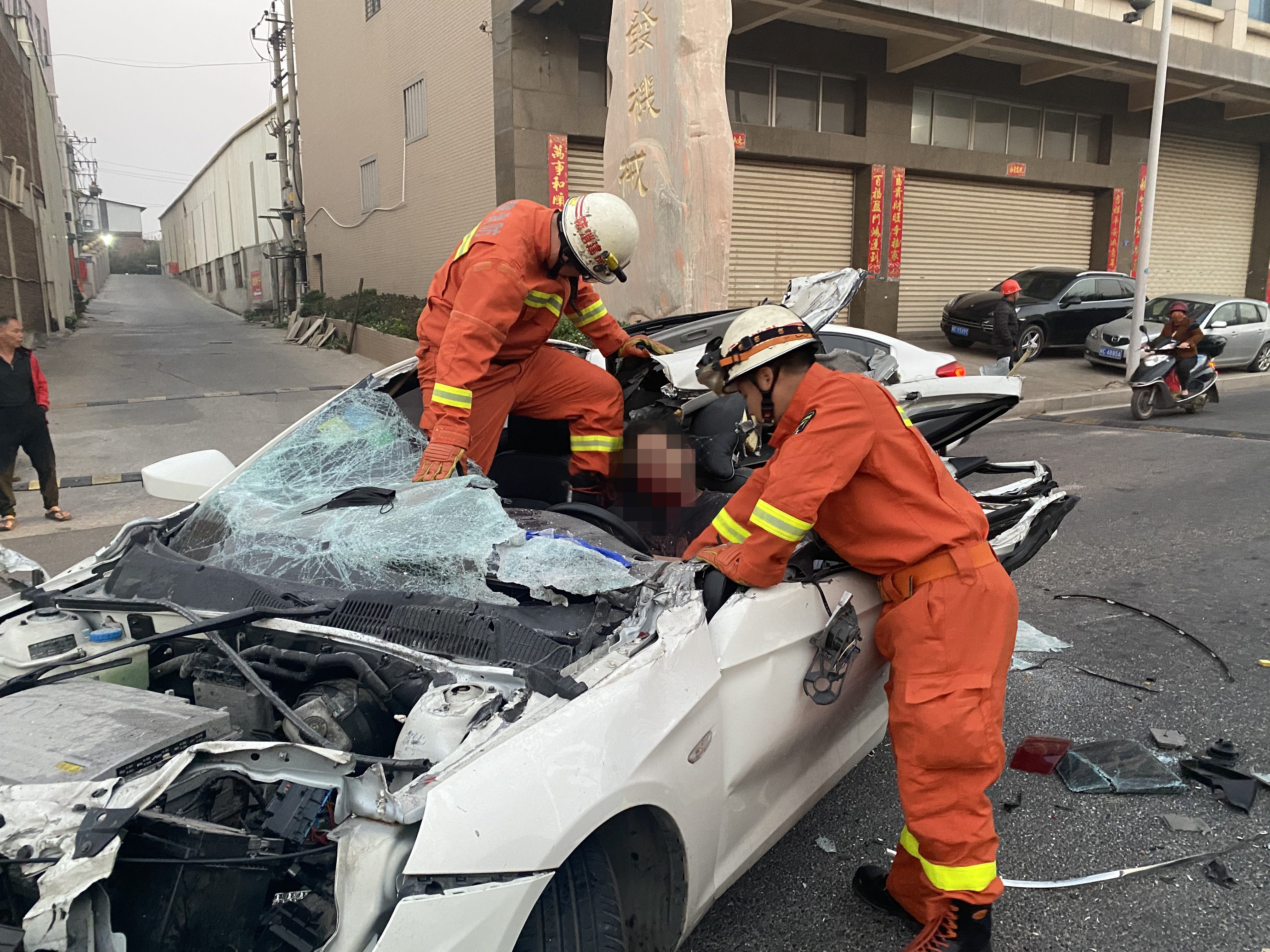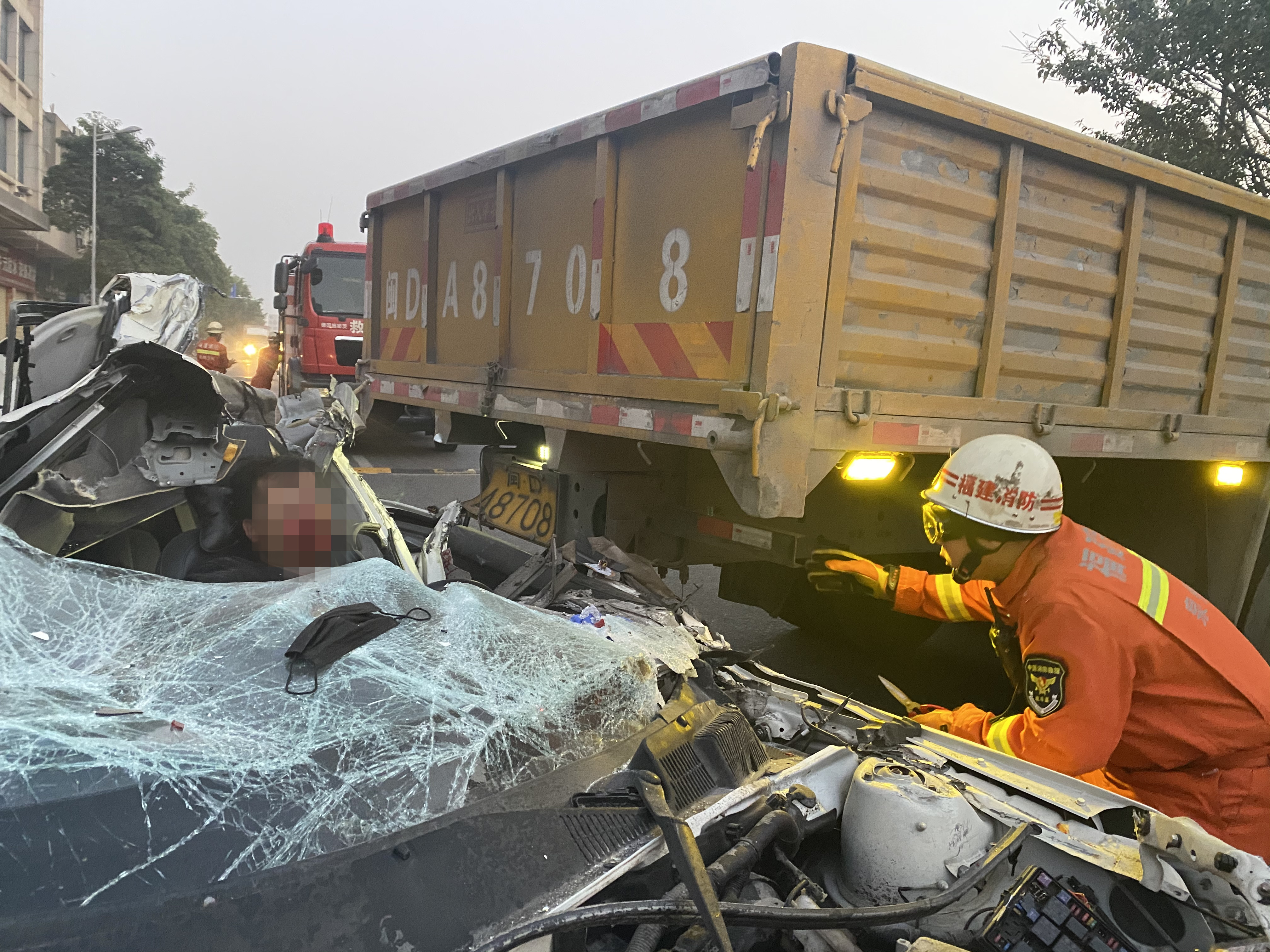 3月16日清晨5时54分许,在晋江安海镇兴安路路段,一辆小轿车追尾一辆正在调头的大货车,导致轿车司机被困在车内,情况万分紧急。晋江市安海消防救援站接到报警后,立即派员到场处置。
