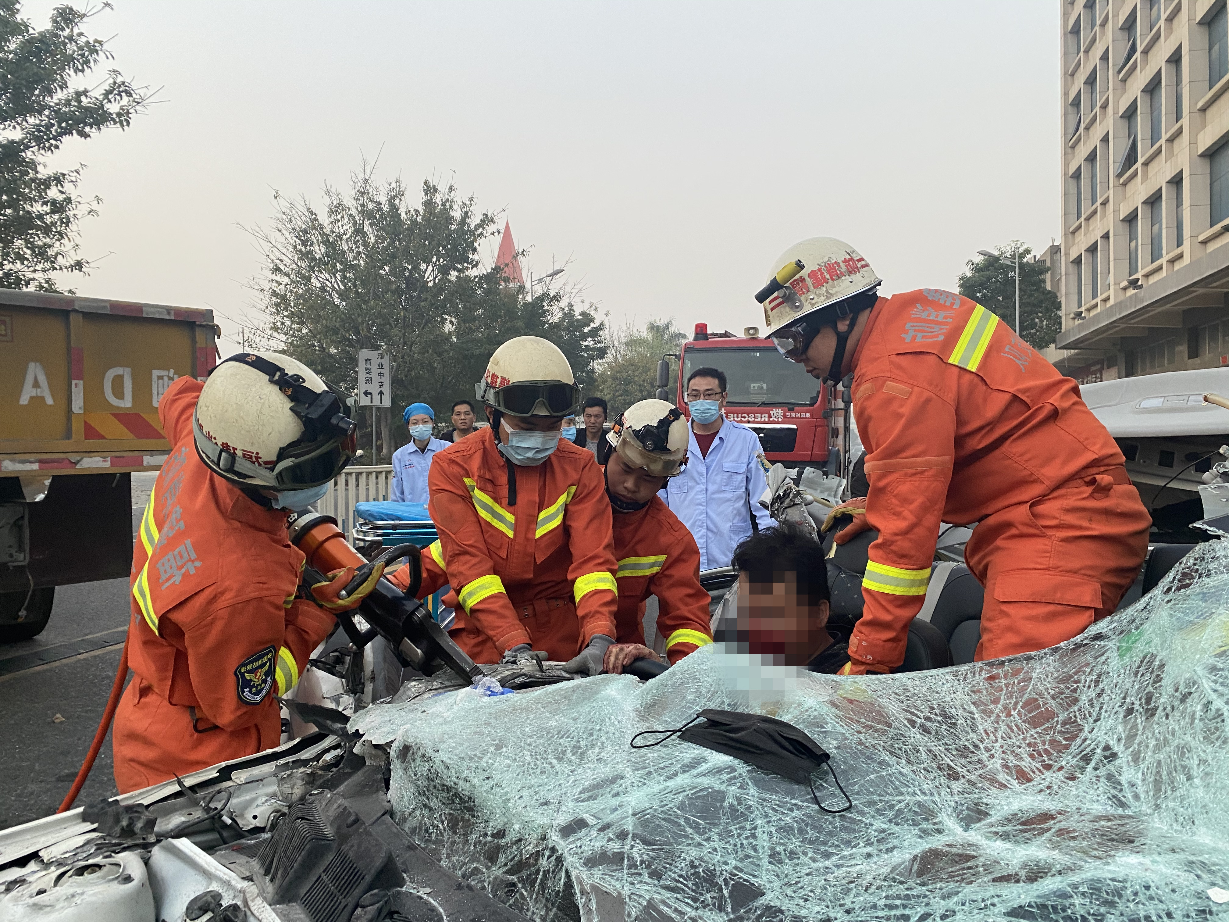 消防员到达现场后发现,追尾前车的轿车整体已经严重变形,司机被困在里面动弹不得 ,满脸鲜血不断呻吟着。在确定司机意识较为清醒且无危险后,消防员立即使用液压破拆工 具组先将严重变形的车门剪开。随后,众人合力将司机从车上抬出,移交给到场的120救护车送往医院进行进一步检查治疗。