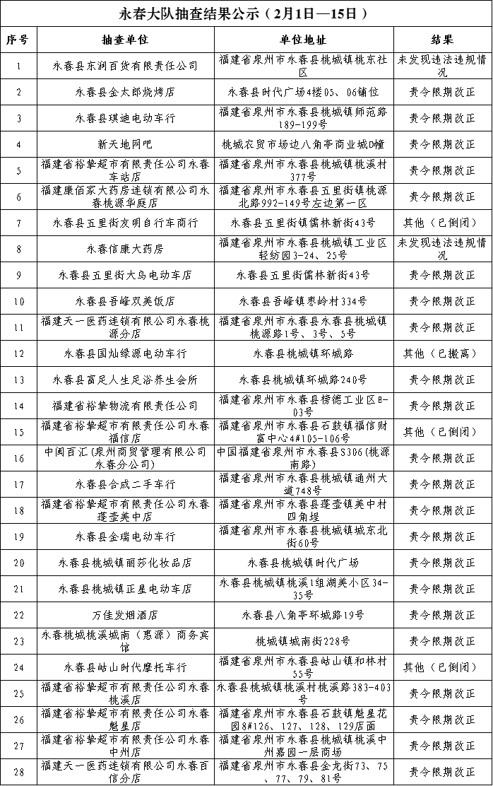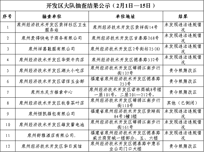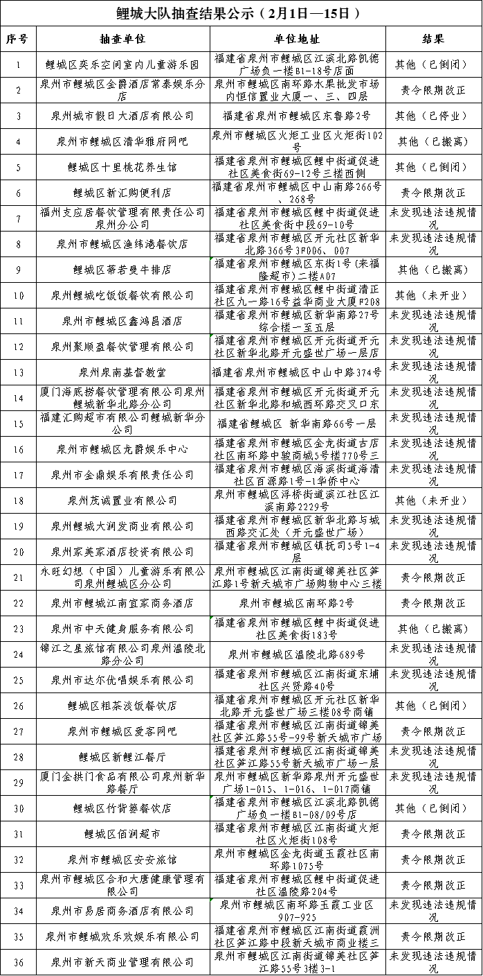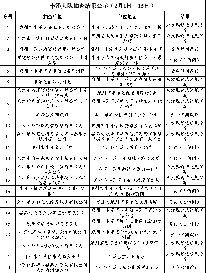 根据《福建省“双随机、一公开”消防监督抽查实施细则(试行)》工作要求, 2月1日-2月15日,泉州市各级消防救援部门采取专项抽查、日常“双随机一公开”监督抽查方式对部分重点场所及其他社会单位履行消防安全职责情况开展监督检查。现将抽查结果公示如下: