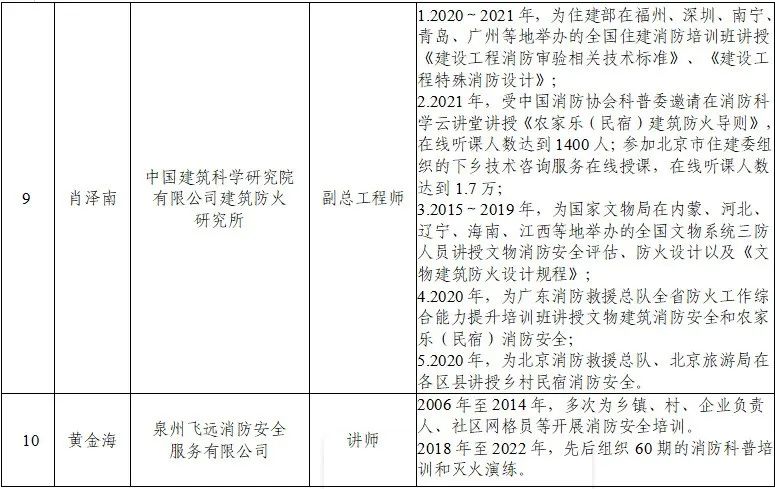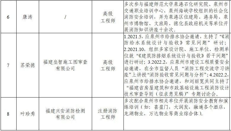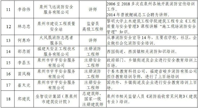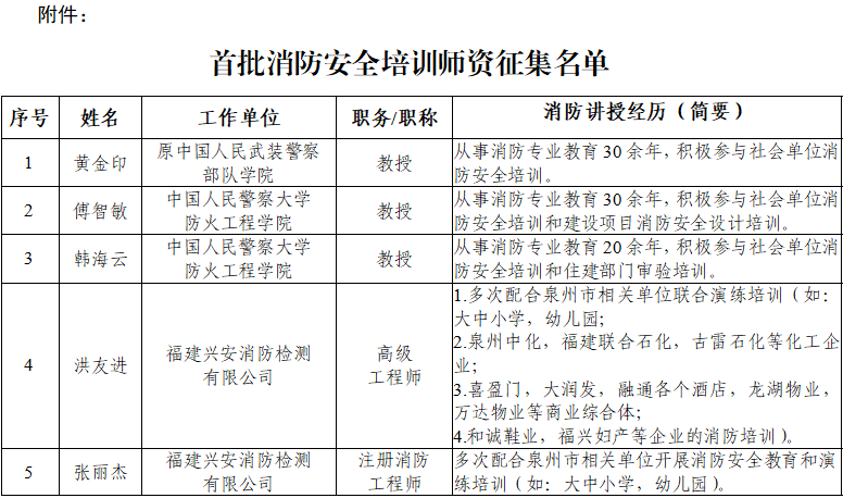 为建立健全消防安全培训师资队伍,泉州市消防安全委员会办公室依托全市消防安全领域专家库人员以及高校、行业领域专家人才等开展征集、摸底,共征集到18名消防安全培训师资人员(详见附件,排名不分先后),现发各有关单位,供开展消防安全大培训时参考聘用。