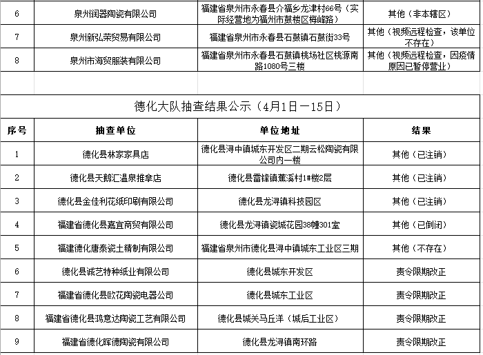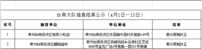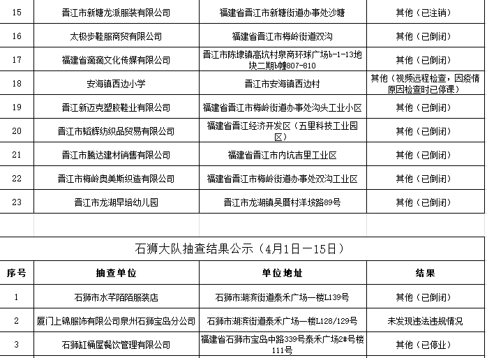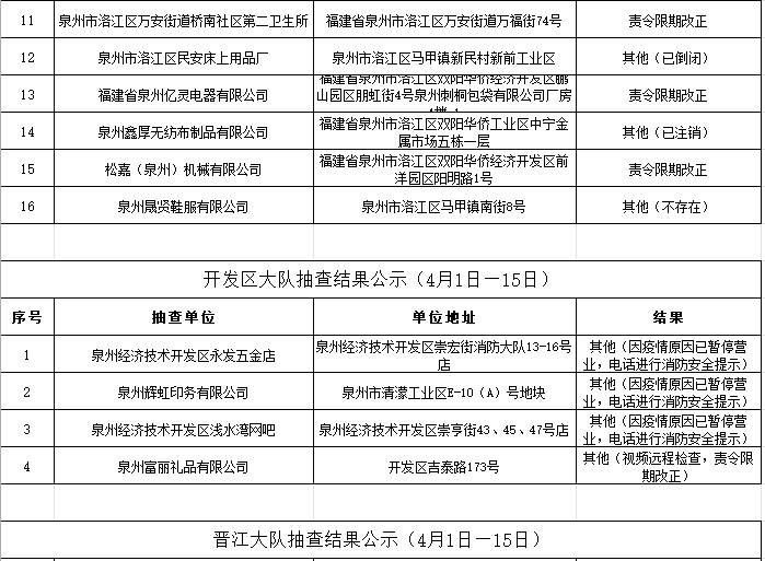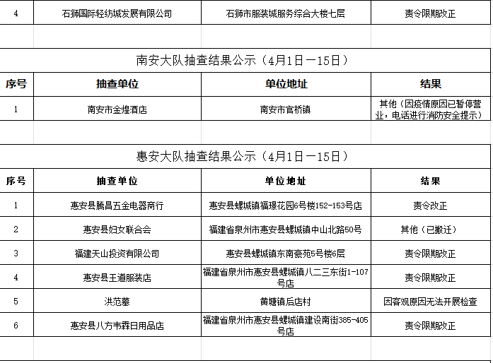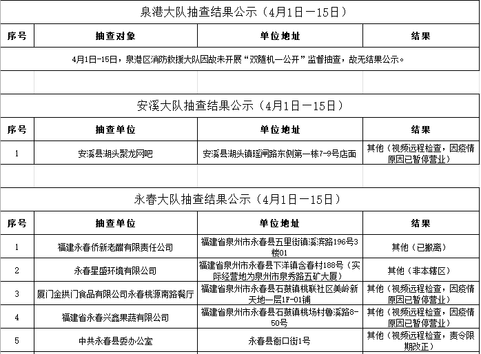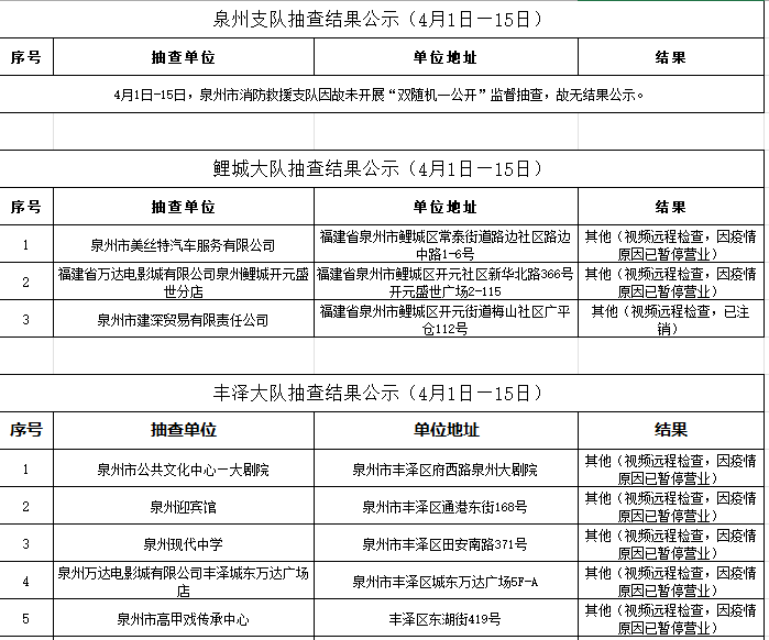根据《福建省“双随机、一公开”消防监督抽查实施细则(试行)》工作要求,2022年4月1日-15日,泉州市各级消防救援部门采取“双随机一公开”监督抽查方式对社会单位履行消防安全职责情况开展监督检查。现将抽查结果公示如下: